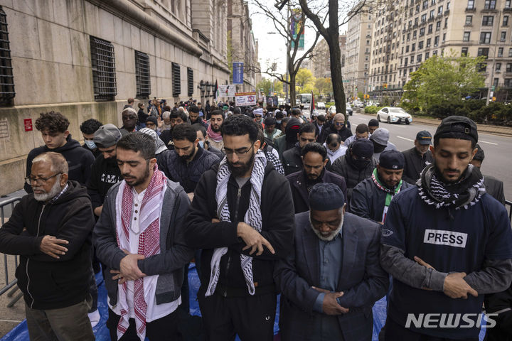 [뉴욕=AP/뉴시스] 26일(현지시각) 미국 뉴욕의 컬럼비아 대학교 밖에서 '주무아(금요기도) 연대' 행사가 열려 무슬림으로 보이는 사람들이 기도하고 있다. 2024.04.27.