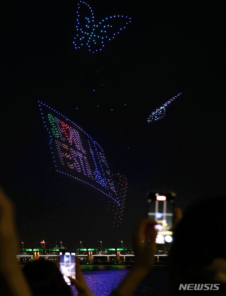 [서울=뉴시스] 홍효식 기자 = 27일 오후 서울 송파구 잠실한강공원에서 2024 한강 불빛 공연 '드론 라이트 쇼'가 진행되고 있다. 2024.04.27. [email protected]