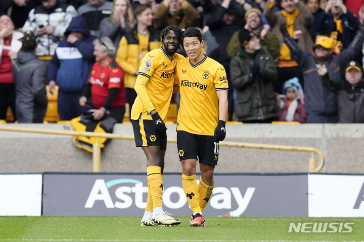 [울버햄프턴=AP/뉴시스] 울버햄프턴 원더러스의 황희찬(오른쪽)이 27일(현지시각) 영국 울버햄프턴의 몰리뉴 스타디움에서 열린 2023-24 프리미어리그(EPL) 35라운드 루턴 타운과 경기 전반 39분 선제골을 넣고 동료와 기쁨을 나누고 있다. 황희찬은 넉 달 만에 리그 11호를 기록하며 팀의 2-1 승리를 이끌었다. 2024.04.28.