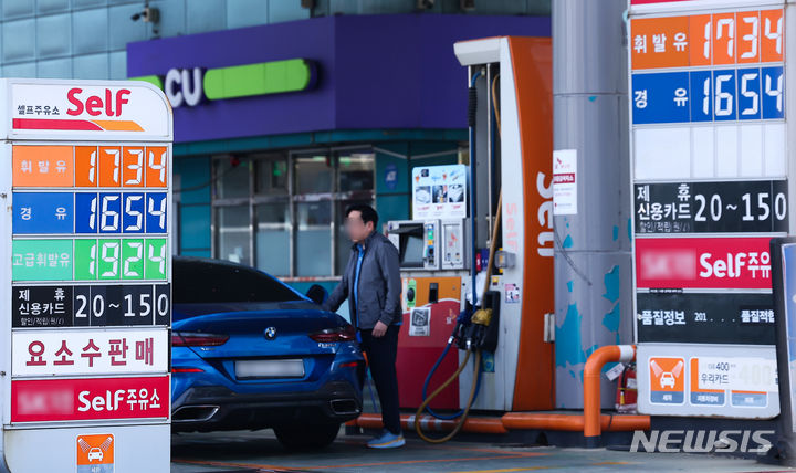 [서울=뉴시스] 김근수 기자 = 28일 서울 시내의 주유소에서 한 시민이 주유를 하고 있다. 한국석유공사 유가정보서비스 오피넷에 따르면 4월 넷째 주 기준 휘발유의 평균 판매 가격은 L당 1708.4원으로 전주 대비 13.3원 상승했으며, 경유는 1566.7원으로 4.4원 올랐다. 2024.04.28. [email protected]