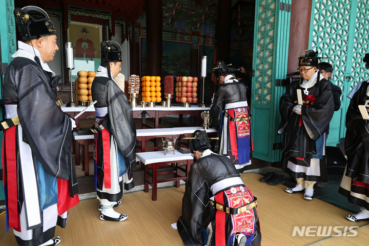 [아산=뉴시스] 김명원 기자 = 충무공 탄신일인  28일 오전 충남 아산시 현충사에서 충무공 탄신 제479주년 기념행사가 열린 가운데 시민대표 한상우씨가이 신위에 마지막 술잔을 올리는 종헌례의 예를 하고 있다. 2024.04.28. [email protected]