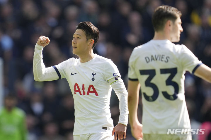 [런던=AP/뉴시스] 토트넘 홋스퍼의 손흥민이 28일(현지시각) 영국 런던의 토트넘 홋스퍼 스타디움에서 열린 2023-24 프리미어리그(EPL) 35라운드 아스널과의 경기 후반 42분 페널티킥으로 팀의 두 번째 골을 넣고 세리머니하고 있다. 풀타임을 소화한 손흥민은 리그 16호를 기록했고 팀은 2-3으로 패했다. 2024.04.29.