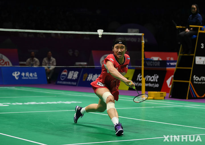[청두=신화/뉴시스] 안세영이 28일(현지시각) 중국 쓰촨성 청두에서 열린 세계배드민턴연맹(BWF) 제30회 여자세계단체선수권 대회(우버컵) D조 2차전 미국과 제1 경기 단식에 나서 베이원 장과 경기하고 있다. 안세영이 2-0(21-11 21-16)으로 이기고 나머지 경기도 모두 승리하며 한국이 미국을 5-0으로 꺾고 2승을 올렸다. 2024.04.29.