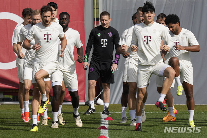 [뮌헨=AP/뉴시스] 바이에른 뮌헨(독일)의 김민재(오른쪽)가 29일(현지시각) 독일 뮌헨의 알리안츠 아레나에서 열리는 2023-24 유럽축구연맹(UEFA) 챔피언스리그(UCL) 레알 마드리드(스페인)와 준결승 1차전을 앞두고 동료들과 몸을 풀고 있다. 2024.04.30.
