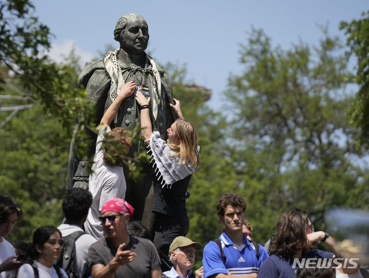 [오스틴=AP/뉴시스] 29일(현지시각) 미 텍사스주 오스틴에 있는 텍사스대학교에서 친팔레스타인 시위 참가자들이 조지 워싱턴 동상에 '팔레스타인 해방'이라고 쓰인 스티커를 붙이고 있다. 2024.04.30.