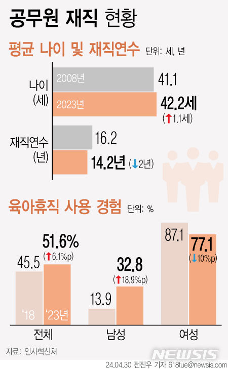 [그래픽] 공무원 평균 연령 42.2세…남성 육아휴직 14→33% 2.4배 증가