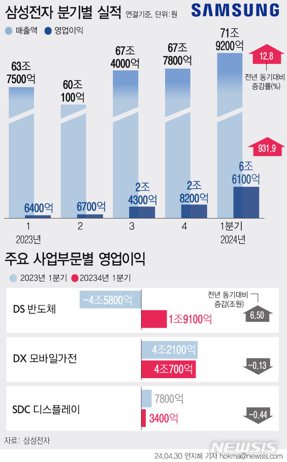 [서울=뉴시스] 삼성전자가 30일 연결 기준으로 매출 71조9200억원, 영업이익 6조6100억원의 1분기 실적을 발표했다. 특히 IT 시황 회복으로 메모리 반도체 부문이 고부가 제품 수요 대응으로 흑자 전환에 성공했다. (그래픽=안지혜 기자)