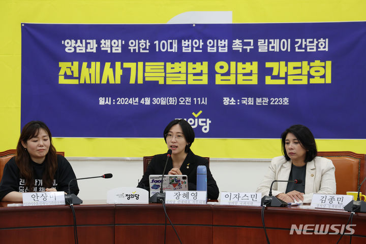 [서울=뉴시스] 고승민 기자 = 장혜영 정의당 원내대표 직무대행이 30일 서울 여의도 국회에서 열린 전세사기특별법 입법간담회에서 발언하고 있다. 2024.04.30. [email protected]