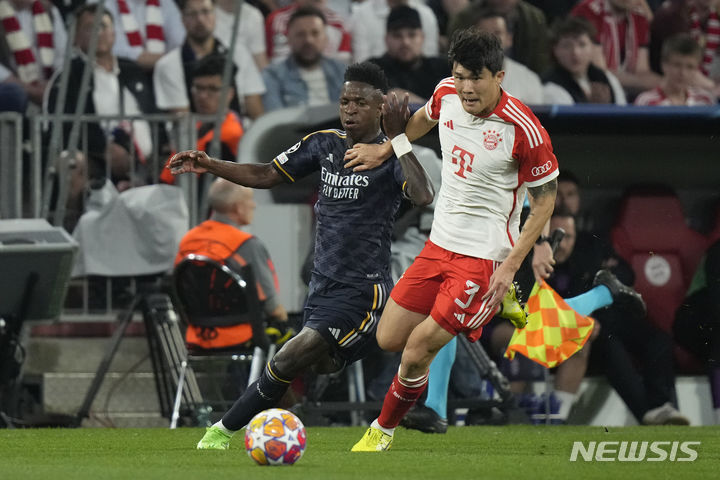 [뮌헨=AP/뉴시스] 바이에른 뮌헨(독일)의 김민재가 지난달 30일(현지시각) 독일 뮌헨의 알리안츠 아레나에서 열린 2023-24 유럽축구연맹(UEFA) 챔피언스리그(UCL) 준결승 1차전 레알 마드리드(스페인)와 경기 중 공을 다투고 있다. 김민재는 풀타임을 소화했으나 동점 골의 빌미를 제공하면서 뮌헨은 2-2 무승부를 기록했다. 2024.05.01.