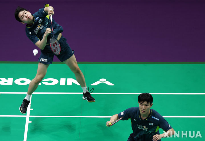 [청두=신화/뉴시스] 강민혁-서승재 조가 지난달 30일(현지시각) 중국 쓰촨성 청두에서 열린 세계배드민턴연맹(BWF) 제33회 세계남자단체배드민턴선수권대회(토마스컵) A조 3차전 중국과의 경기 1복식에 출전해 량웨이컹-왕창 조와 경기하고 있다. 한국은 강민혁-서승재가 2-1(21-16 15-21 21-15)로 승리하는 등 복식 두 경기는 모두 이겼으나 단식 세 경기를 모두 내줘 2-3으로 패해 조 2위의 기록으로 8강에 올랐다. 2024.05.01.