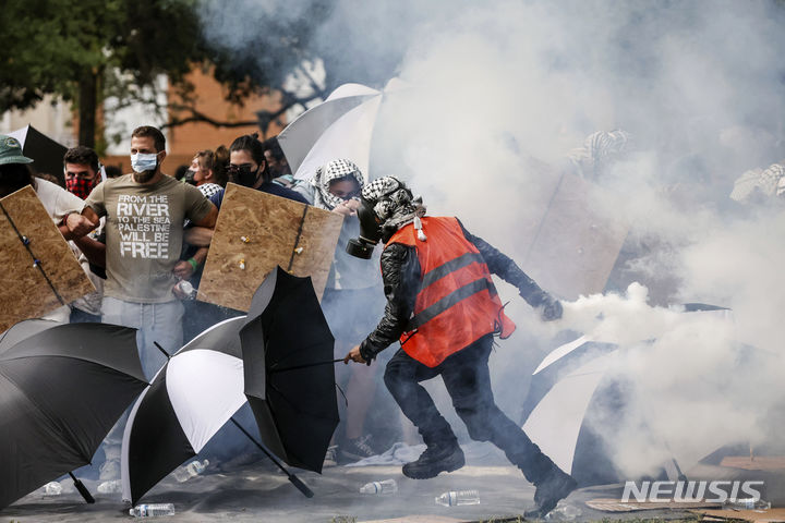 [탬파=AP/뉴시스] 지난달 30일(현지시각) 미 플로리다주 탬파에 있는 사우스플로리다대학 내 MLK 플라자에서 방독면을 착용한 친팔레스타인 시위 참가자가 경찰이 쏜 최루탄을 집어 경찰을 향해 던지고 있다. 2024.05.01.