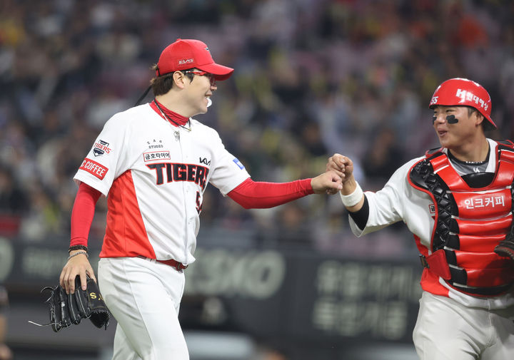 [서울=뉴시스] 김진아 기자 =1일 광주기아챔피언스필드에서 열린 프로야구 kt wiz와 KIA 타이거즈의 경기, KIA 선발 양현종이 포수 한준수와 기뻐하고 있다. 양현종은 9이닝 8피안타 1실점으로 1694일 만에 완투승을 기록했다. (사진=KIA 타이거즈 제공) 2024.05.01. [email protected] *재판매 및 DB 금지