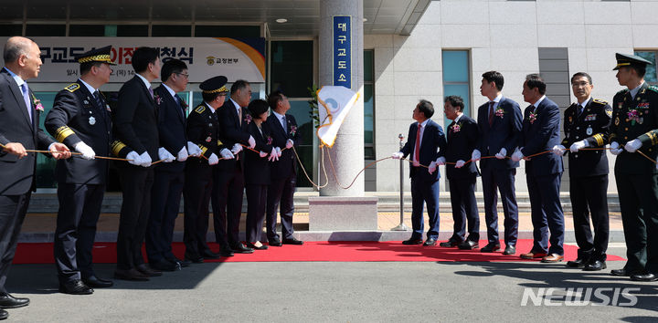 [대구=뉴시스] 이무열 기자 = 박성재(왼쪽 첫 번째) 법무부 장관과 홍준표(오른쪽 첫 번째) 대구시장을 비롯한 내빈들이 2일 대구 달성군 대구교도소에서 열린 이전 개청식에서 현판 제막식을 하고 있다. 2024.05.02. [email protected]