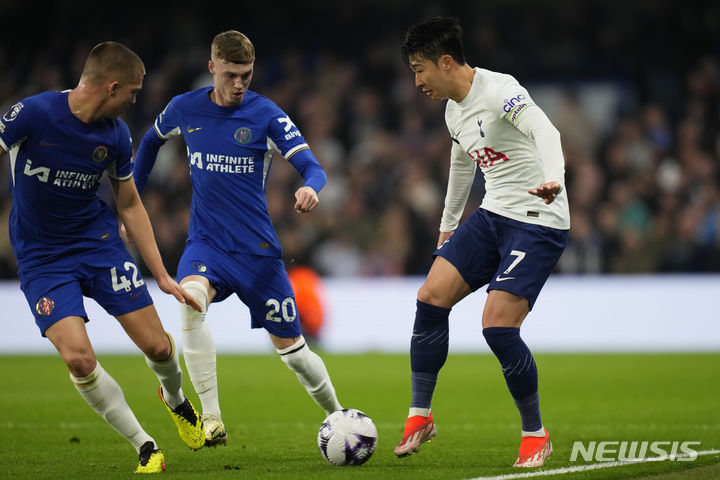 [런던=AP/뉴시스] 토트넘 홋스퍼의 손흥민이 2일(현지시각) 영국 런던의 스탬퍼드 브리지 경기장에서 열린 2023-24 프리미어리그(EPL) 26라운드 첼시와의 순연 경기 중 공을 다투고 있다. 손흥민은 풀타임을 소화했고 팀은 0-2로 패해 최근 3경기 연속 패배하며 리그 5위를 벗어나지 못했다. 2024.05.03.