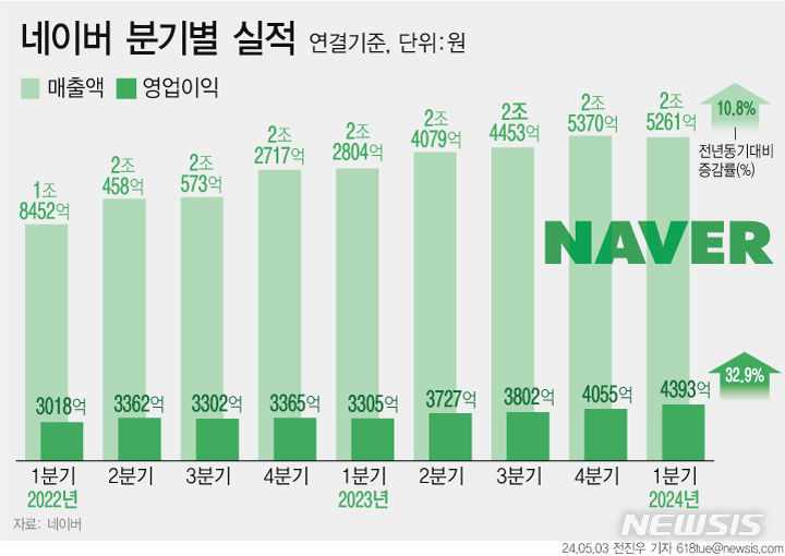 [서울=뉴시스] 3일 네이버는 올 1분기 연결 재무제표 기준 매출 2조5261억원, 영업이익 4393억원을 기록했다고 공시했다. 전년 동기 대비 매출은 10.8% 증가했고 영업이익은 32.9% 늘었다. (그래픽=전진우 기자)