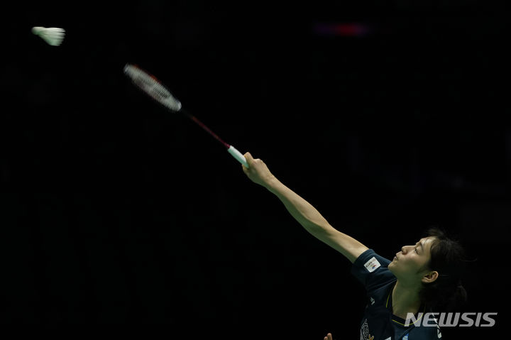 [청두=AP/뉴시스] 심유진이 3일(현지시각) 중국 쓰촨성 청두에서 열린 세계배드민턴연맹(BWF) 제30회 여자세계단체선수권 우버컵 8강전 대만과의 경기 제2 단식에 출전해 쑹숴원과 경기하고 있다. 심유진이 2-0(21-5 21-15)으로 승리했다. 2024.05.03.
