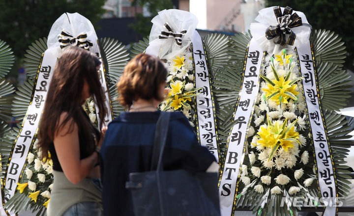 [서울=뉴시스] 김혜진 기자 = 3일 서울 용산구 하이브 사옥 앞에 소속사의 대응을 비판하고 방탄소년단을 지지하는 근조화환이 놓여 있다. 2024.05.03. [email protected]