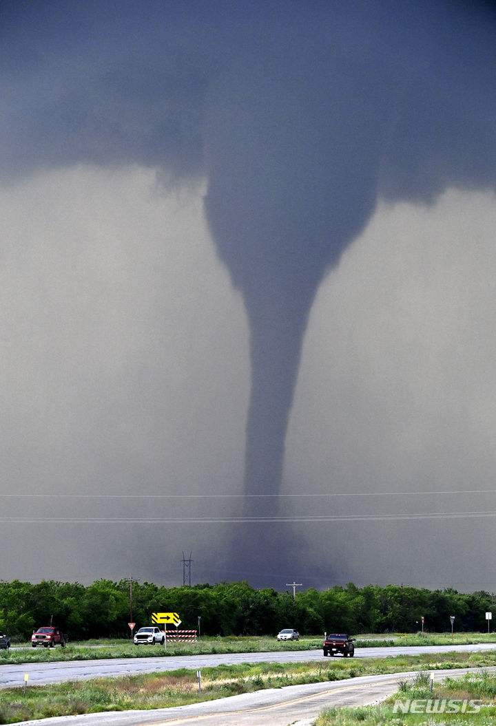 [홀리=AP/뉴시스] 지난 2일(현지시각) 미 텍사스주 홀리의 277번 국도 뒤로 토네이도가 이동하고 있다. 이날 홀리에 야구공 크기만 한 우박이 떨어진 것으로 보고됐으며 주택 약 30채가 파손된 것으로 집계됐다. 2024.05.04.