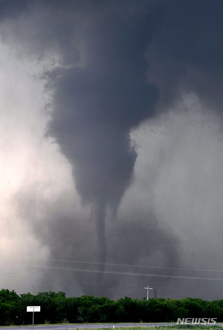 [홀리=AP/뉴시스] 지난 2일(현지시각) 미 텍사스주 홀리의 277번 국도 뒤로 토네이도가 휘몰아치고 있다. 이날 홀리에 야구공 크기만 한 우박이 떨어진 것으로 보고됐으며 주택 약 30채가 파손된 것으로 집계됐다. 2024.05.04.
