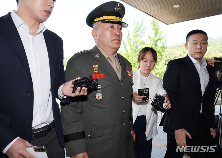 [과천=뉴시스] 김진아 기자 = 김계환 해병대사령관이 '해병대 채모 상병 사망 사건 수사외압 의혹' 관련 조사를 받기 위해 4일 오전 경기 정부과천청사 고위공직자범죄수사처(공수처)에 피의자 신분으로 출석하고 있다. 2024.05.04. [email protected]