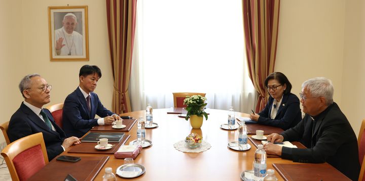 [서울=뉴시스] 배훈식 기자 = 유인촌 문화체육관광부 장관이 3일(현지시간) 바티칸 교황청에서 교황청 성직자성 장관 유흥식 추기경을 만나 면담을 하고 있다. (사진=문화체육관광부 제공) 2024.05.05. [email protected].