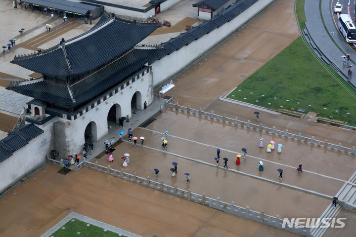 [서울=뉴시스] 배훈식 기자 = 전국에 비가 내린 5일 오후 서울 종로구 광화문 월대에서 우산을 쓴 관광객들이 기념사진을 찍고 있다. 2024.05.05. [email protected]