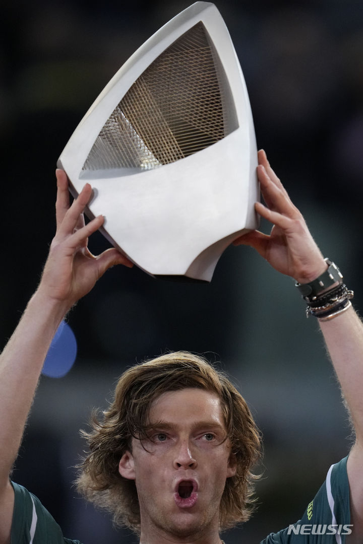 [마드리드=AP/뉴시스] 안드레이 루블레프(8위·러시아)가 5일(현지시각) 스페인 마드리드에서 열린 남자프로테니스(ATP) 투어 무투아 마드리드오픈 단식 정상에 올라 트로피를 들어 올리고 있다. 루블레프는 결승전에서 펠릭스 오제알리아심(35위·캐나다)에 2-1(4-6 7-5 7-5) 역전승을 거두고 우승했다. 2024.05.06.