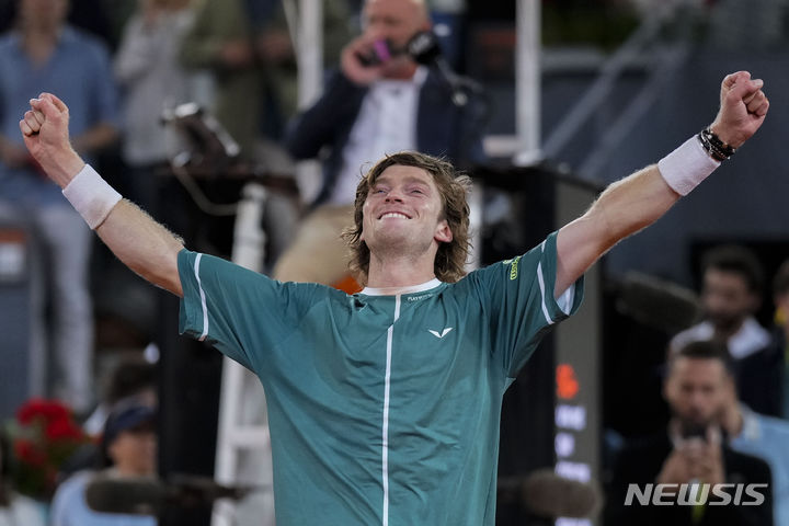 [마드리드=AP/뉴시스] 안드레이 루블레프(8위·러시아)가 5일(현지시각) 스페인 마드리드에서 열린 남자프로테니스(ATP) 투어 무투아 마드리드오픈 단식 결승전에서 승리하며 환호하고 있다. 루블레프는 펠릭스 오제알리아심(35위·캐나다)에 2-1(4-6 7-5 7-5) 역전승을 거두고 우승했다. 2024.05.06.