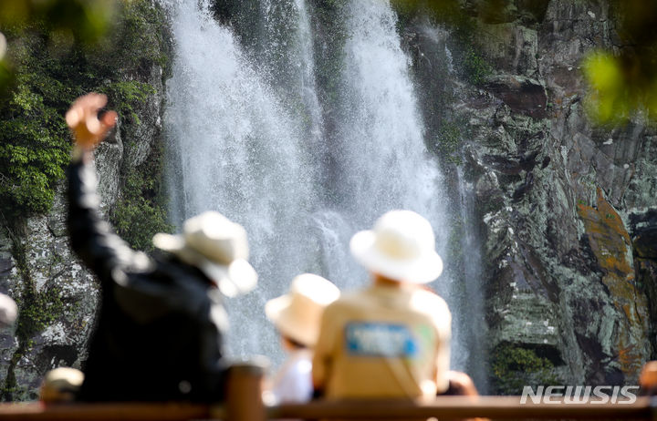 [서귀포=뉴시스] 우장호 기자 = 맑은 날씨를 회복한 6일 오전 제주 서귀포시 강정동 엉또폭포를 찾은 관광객들이 절벽 아래로 떨어지는 시원한 물줄기를 감상하고 있다. 평소 물이 흐르지 않는 엉또폭포는 전날 한라산에 900㎜가 넘는 폭우가 쏟아지자 좀처럼 보기 힘든 장관을 연출했다. 2024.05.06. [email protected]