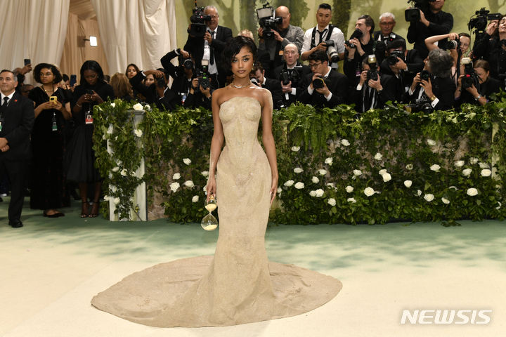 [뉴욕=AP/뉴시스] 가수 타일라가 지난 6일(현지시각) 미국 뉴욕 메트로폴리탄 미술관 의상 연구소(Metropolitan Museum of Art's Costume Institute) 주최로 열린 '2024 멧 갈라(Met gala)' 오프닝 행사에 참석해 포즈를 취하고 있다. 2024.05.08