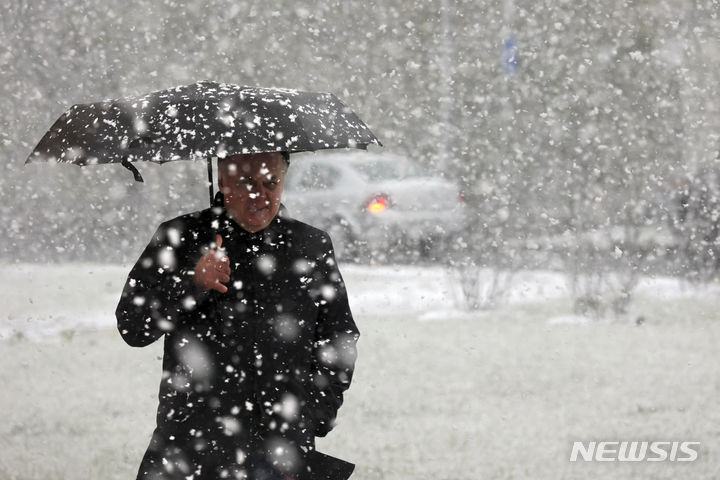 [부다페스트=AP/뉴시스] 8일(현지시각) 러시아 모스크바에서 우산을 쓴 한 남성이 눈 내리는 거리를 걷고 있다. 모스크바에 이례적인 추운 날씨가 찾아와 기온이 2도까지 떨어졌으며 추운 날씨는 당분간 계속될 것으로 예보됐다. 2024.05.09.