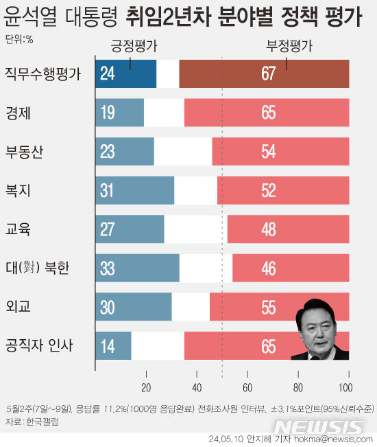 [서울=뉴시스] 갤럽 조사 기준 윤석열 대통령의 지지율이 24%로 집계됐다. 역대 대통령 취임 2년 지지율 가운데 가장 낮은 수치다. 분야별 정책 평가를 보면 ‘대북정책’에 대한 긍정평가율이 33%로 가장 높았다. 이어 ‘복지’ 31%, ‘외교’ 30%, ‘교육’ 27%, ‘부동산’ 23% 등 순이었다. 경제 분야는 긍정평가는 19%에 그쳤다. (그래픽=안지혜 기자)