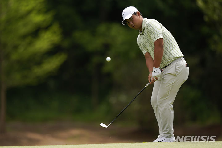 [샬럿=AP/뉴시스] 김주형이 10일(현지시각) 미 노스캐롤라이나주 샬럿의 퀘일 할로 클럽에서 열린 미국프로골프(PGA) 투어 웰스파고 챔피언십 2라운드 12번 그린에서 칩샷하고 있다. 김주형은 중간 합계 이븐파 142타 공동 33위를 기록했다. 2024.05.11.