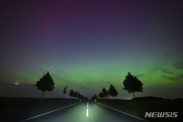 [노이마르크=AP/뉴시스] 10일(현지시각) 독일 튀링겐주 노이마르크 상공에 북극광(오로라)이 빛나고 있다. 2024.05.11.