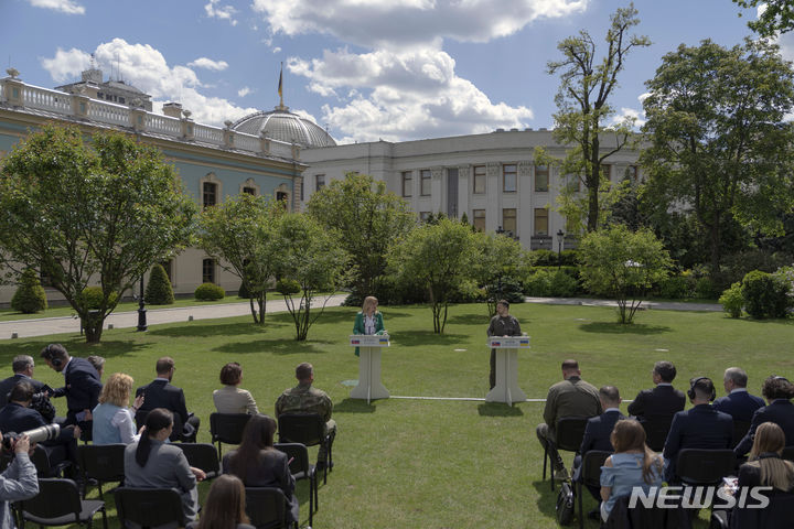 [키이우=AP/뉴시스] 볼로디미르 젤렌스키(오른쪽) 우크라이나 대통령이 10일(현지시각) 키이우에서 주자나 차푸토바 슬로바키아 대통령과 공동 기자회견을 하고 있다. 2024.05.11.