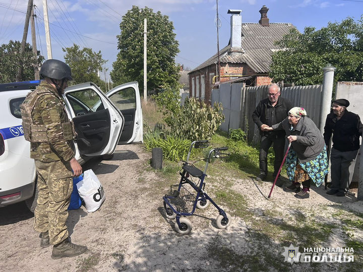 [보우차스크=AP/뉴시스] 우크라이나 경찰이 제공한 사진에 10일(현지시각) 우크라이나 하르키우주 보우차스크 마을에서 경찰관들이 노인들을 러시아의 공격으로부터 대피시키고 있다. 우크라이나군 당국은 국경을 넘어 하르키우주로 진입한 러시아군과 치열한 전투를 벌이고 있다고 전했다. 2024.05.11.