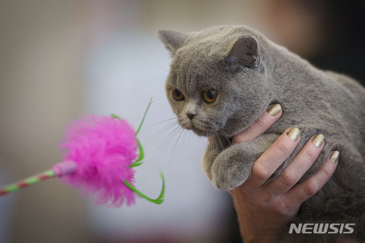 [부쿠레슈티=AP/뉴시스] 12일(현지시각) 루마니아 부쿠레슈티에서 '2024 국제 미묘(美猫) 대회'가 열려 대회에 출전한 고양이 한 마리가 심사받는 동안 장난감을 바라보고 있다. 2024.05.13.