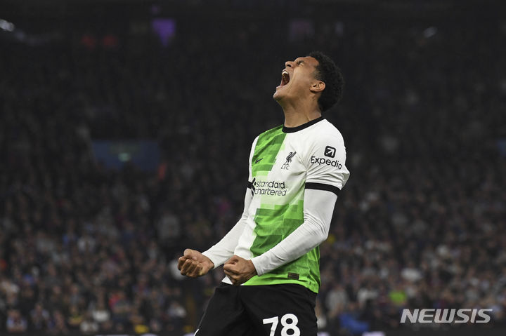 [버밍엄=AP/뉴시스] 리버풀의 자렐 콴사가 13일(현지시각) 영국 버밍엄의 빌라 파크에서 열린 2023-24 프리미어리그(EPL) 37라운드 애스턴 빌라와의 경기 후반 3분 팀의 세 번째 골을 넣고 환호하고 있다. 리버풀은 후반 막판 내리 2골을 허용해 3-3으로 비겼다. 이로써 토트넘이 4위를 하기 위해서는 남은 2경기 모두를 이기고 현재 4위인 애스턴 빌라가 남은 최종전에서 져야 한다. 2024.05.14.