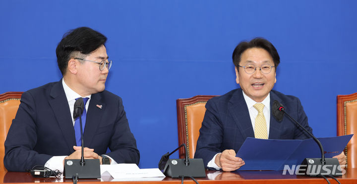 [서울=뉴시스] 권창회 기자 = 강기정 광주광역시장이 14일 오전 서울 여의도 국회에서 박찬대 더불어민주당 원내대표를 접견하며 발언하고 있다. 2024.05.14. [email protected]