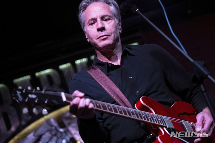 [키이우=AP/뉴시스] 토니 블링컨 미국 국무장관이 14일(현지시각) 우크라이나 키이우의 '바르만 딕탯' 바에서 현지 밴드 '19.99'와 함께 캐나다 출신 가수 '닐 영'의 1989년 히트곡 '록킹 인 더 프리 월'(Rockin' in the Free World)을 연주하고 있다. 2024.05.15.