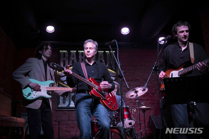[키이우=AP/뉴시스] 토니 블링컨 미국 국무장관이 14일(현지시각) 우크라이나 키이우의 '바르만 딕탯' 바에서 현지 밴드 '19.99'와 함께 캐나다 출신 가수 '닐 영'의 1989년 히트곡 '록킹 인 더 프리 월'(Rockin' in the Free World)을 연주하고 있다. 2024.05.15.