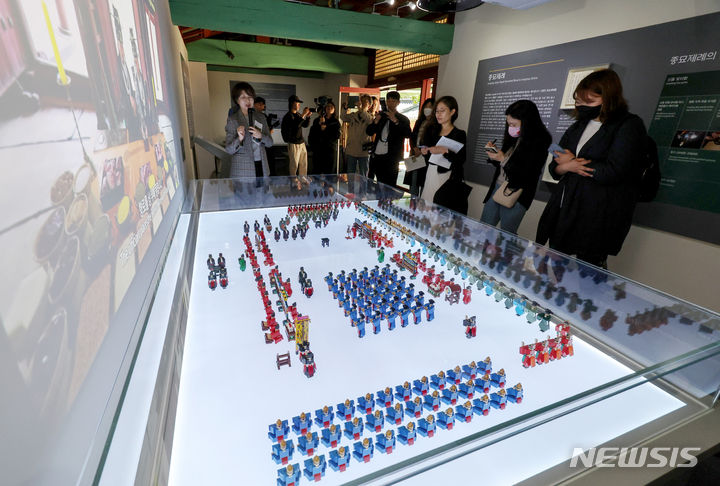 [서울=뉴시스] 김진아 기자 = 16일 서울 종로구 종묘 향대청 전시관 지오실에 '레고' 작가 콜린 진이 구현한 '레고 오향친제반차도'가 전시돼 있다. 2024.05.16. [email protected]