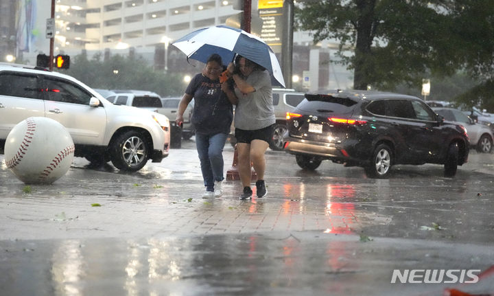 [휴스턴=AP/뉴시스] 16일(현지시각) 미 텍사스주 휴스턴에서 2024 메이저리그(MLB) 휴스턴 애스트로스와 오클랜드 애슬레틱스의 경기를 보러 왔던 야구팬들이 심한 뇌우를 맞으며 경기장인 미닛메이드 파크로 들어가고 있다. 2024.05.17.