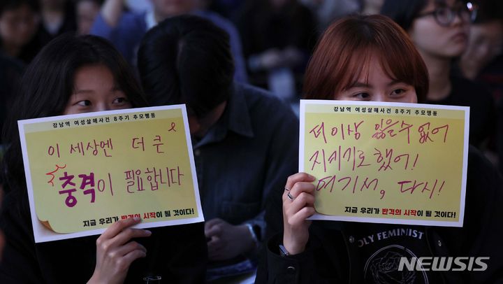 [서울=뉴시스] 김선웅 기자 = 17일 서울 강남역 사거리에서 강남역 살인사건(서초동 주점 화장실 살인사건) 8주기 추모식이 열리고 있다. 서초동 주점 화장실 살인사건은 지난 2016년 5월 17일 서울 강남역 인근 서초동 주점 건물 남녀공용 화장실에서 30대 남성이 일면식이 없는 20대 여성을 흉기로 찔러 살해한 사건이다. 2024.05.17. [email protected]