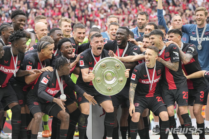 [레버쿠젠=AP/뉴시스] 레버쿠젠 그라니트 자카와 선수들이 18일(현지시각) 독일 레버쿠젠의 바이아레나에서 열린 2023-24 분데스리가 34라운드 최종전에서 아우크스부르크를 꺾은 후 우승컵을 들어 올리며 환호하고 있다. 창단 이후 120년 만에 리그 정상에 오른 레버쿠젠은 아우크스부르크를 2-1로 이기며 리그 사상 처음으로 '무패 우승'을 달성했다. 2024.05.19.