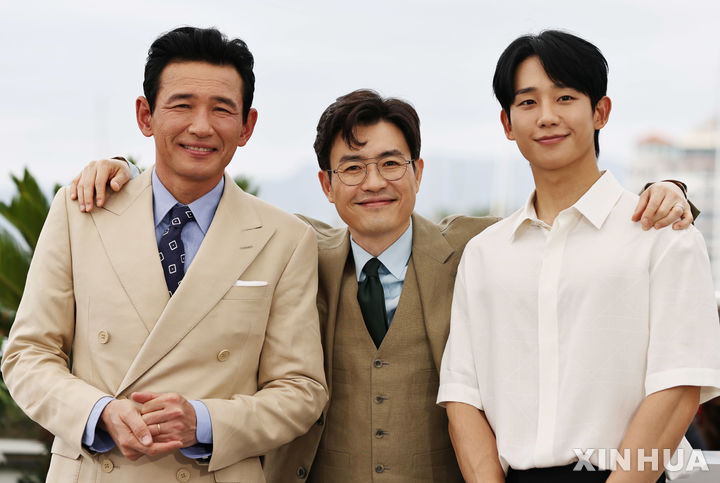 [칸=신화/뉴시스] 배우 황정민(왼쪽부터), 류승완 감독, 배우 정해인이 20일(현지시각) 프랑스 남부 칸에서 열린 제77회 칸국제영화제 미드나이트 스크리닝 부문 초청 영화 '베테랑2' 포토콜 행사에 참석해 포즈를 취하고 있다. 2024.05.21.