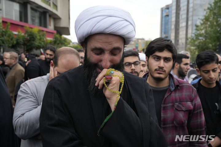 [테헤란=AP/뉴시스] 20일(현지시각) 이란 테헤란의 발리-에-아스르 광장에서 열린 에브라힘 라이시 대통령의 애도식에 참석한 한 성직자가 흐느끼고 있다. 라이시 대통령은 아미르 압돌라히안 외무장관 등과 함께 19일 헬리콥터 추락 사고로 사망했으며 장례식은 오는 23일 그의 고향인 북동부 마슈하드에서 열릴 것으로 알려졌다. 2024.05.21.