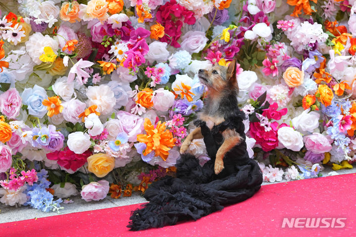 [뉴욕=AP/뉴시스] 20일(현지시각) 미국 뉴욕의 ‘AKC 개 박물관’에서 ‘펫 갈라’가 열려 참가 반려견이 검정 드레스를 뽐내고 있다. '펫 갈라'는 매년 5월 첫 번째 월요일에 뉴욕 메트로폴리탄 뮤지엄에서 열리는 패션쇼 '멧 갈라'에서 영감을 받은 반려동물 패션쇼다. 2024.05.21.