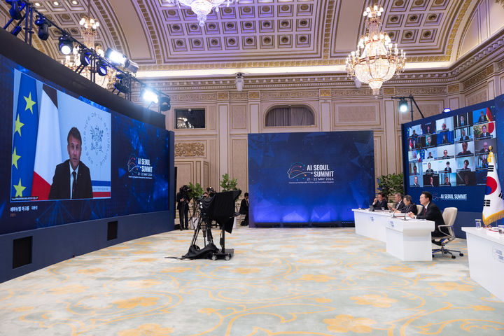 [서울=뉴시스]윤석열 대통령이 21일 청와대 영빈관에서 화상으로 열린 '인공지능(AI)서울 정상회의'에서 에마뉘엘 마크롱 프랑스 대통령의 발표를 경청하고 있다. (사진=대통령실 제공) 2024.05.21. [email protected] *재판매 및 DB 금지