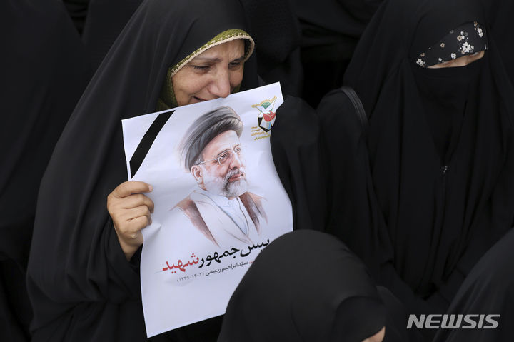 [타브리즈=AP/뉴시스] 이란 대통령실이 공개한 사진에 21일(현지시각) 이란 동아제르바이잔주 타브리즈에서 에브라힘 라이시 대통령의 사진을 든 한 여성이 운구 행렬을 보면서 흐느끼고 있다. 이란 정부는 이날 오전부터 라이시 대통령 등 헬기 사고 희생자들에 대한 장례 일정에 들어가 타브리즈 광장에서의 운구 행렬을 시작으로 23일까지 주요 도시 사원에서 장례식을 거행한다. 2024.05.22.